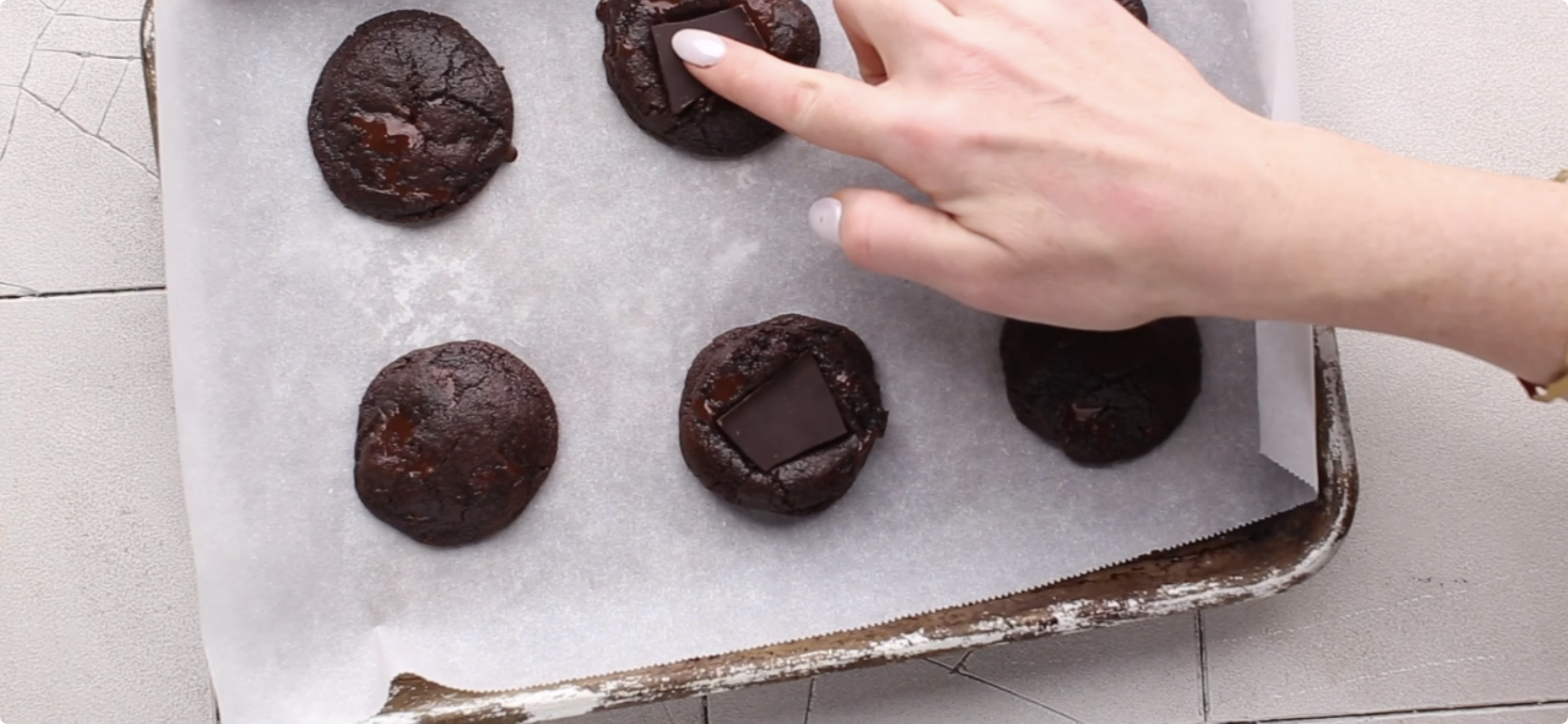 Banging the pan on the counter halfway through baking deflates the cookies. This creates the signature crackly top that makes brownie cookies look so beautiful. It also helps them spread into that perfect flat shape.
